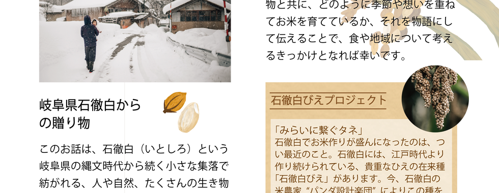 2022/012022年1月1日読了時間: 1分更新日:2023年10月21日works依頼元:パンダ設計楽団(https://www.itoshiiro.com/)制作年:2022/01岐阜県の霊峰白山のふもと、縄文時代から続く小さな集落、郡上市「石徹白(いとしろ)」。 石徹白で無肥料、無農薬のお米とお野菜をつくっている農家のパンダ設計楽団さんから絵本形式のお米のパンフレットをご依頼いただき創造いたしました。